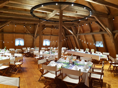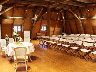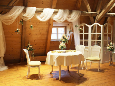 Das ländlich-rustikale Dachgeschoss befindet sich im Kavaliershaus-Ost im Ehrenhof des Schlosses. Durch die sichtbare Balkenkonstruktion entsteht hier ein besonderes Flair. Der Raum eignet sich für eine größere Feier, ob Hochzeit, runder Geburtstag oder Firmenevent. Er verfügt über eine Bar und bietet Platz zum Tanzen.