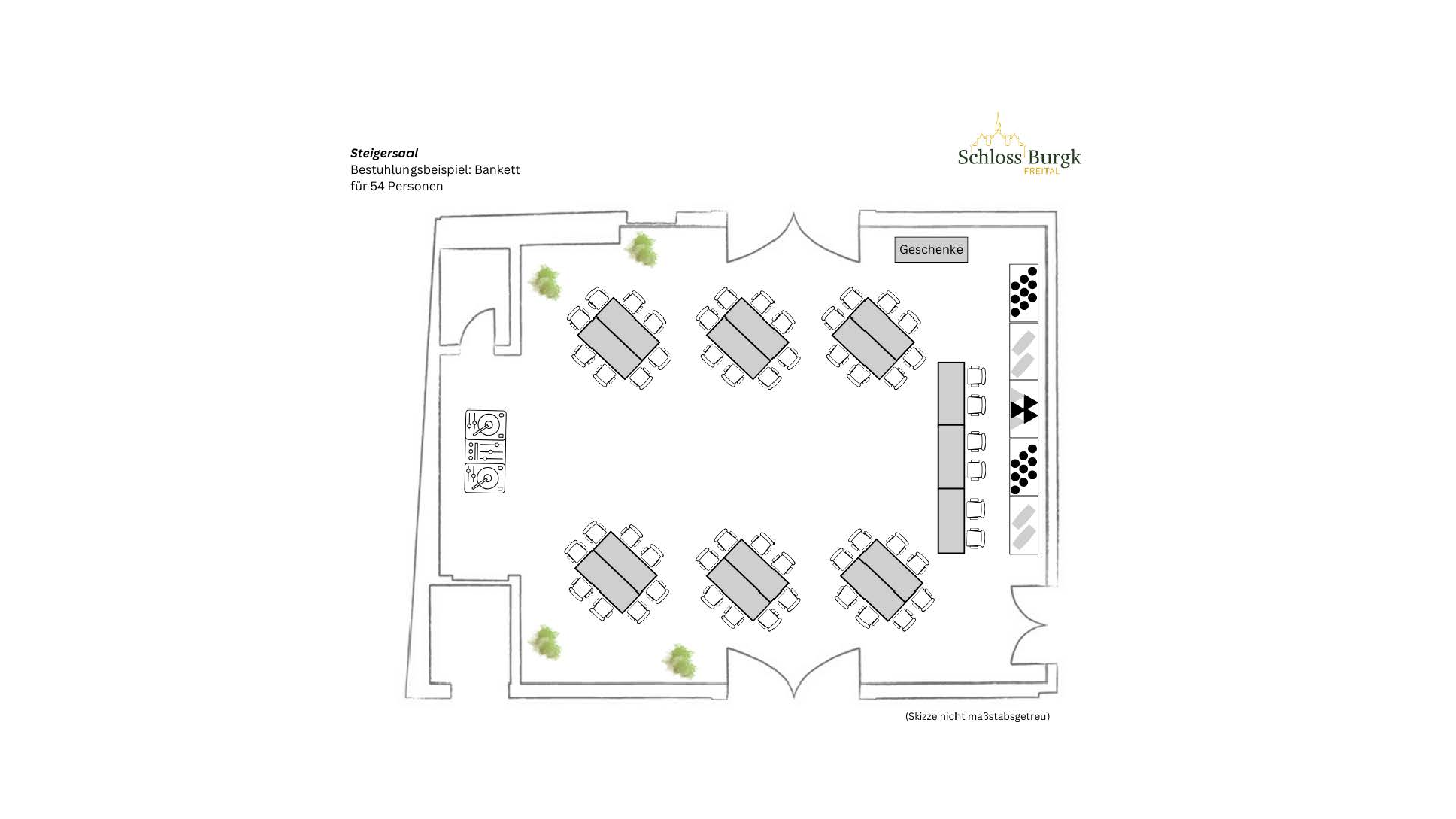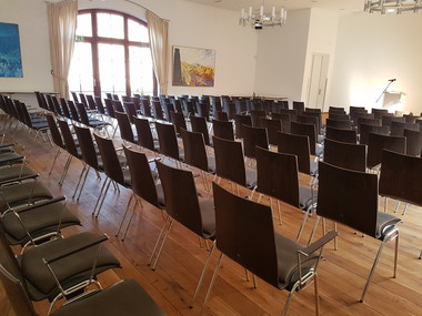Der Steigersaal ist mit 180 m² der geräumigere der beiden Veranstaltungssäle auf Schloss Burgk. Er bietet je nach Bestuhlungsvariante Platz für bis zu 100 Personen (Stuhlreihen bis 160). Durch zwei Glasfassaden auf beiden Seiten des Saals strahlt viel Tageslicht in den Raum und lässt diesen offen und freundlich wirken. Ausgestattet ist der Steigersaal mit hochwertigem Parkett. Es stehen Tische und Stühle für Ihre Veranstaltung zur Verfügung.