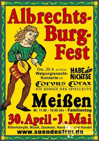 Ohne Frage zählt das Fest des Markgrafen Albrecht auf seiner gleichnamigen Burg hoch über der Elbe bei Meißen zu den bekanntesten Burgfesten in Sachsen. Auf einer Bühne und auf Bänken und Tischen zwischen den Zuschauern zeigen Künstler – Spielleute, Artisten und Gaukler – ihre unnachahmliche Art, die Besucher zu belustigen und zu unterhalten. Im Innenhof vor dem Wendelstein werden 40 Stände mit vorführendem Handwerk, Krämerei und Gastronomie aufgestellt. Auf der großen Bühne spielen Musikformationen des Mittelalters, Gaukler und Narren vollführen Kunststücke und mehrmals täglich schlagen sich die wackeren Ritter der Burgmannschaft.