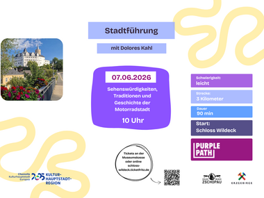 Bei der Stadtführung erfahren Sie allerlei Wissenswertes zu Sehenswürdigkeiten, Traditionen und Geschichte der Motorradstadt Zschopau. Im Anschluss können Sie Kaffee und Kuchen im Schloss Bistro genießen. Anmeldung erwünscht, an der Museumskasse oder im Onlineshop | Vollzahler 5,00 EUR, ermäßigt 2,50 EUR (7-17 Jahre, SchülerInnen, Studierende, Auszubildende, Schwerbeschädigte ab 50% GDB)