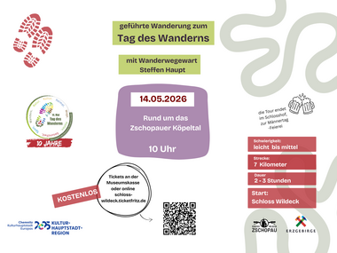 Die Wanderung zum Tag des Wanderns "Rund um das Zschopauer Köpeltal“ startet und endet am Schloss Wildeck, führt über 7 km durch das Köpeltal und lädt anschließend dazu ein, die Unterhaltung zum Männertag im Schlosshof zu genießen. Anmeldung erwünscht, an der Museumskasse oder im Onlineshop